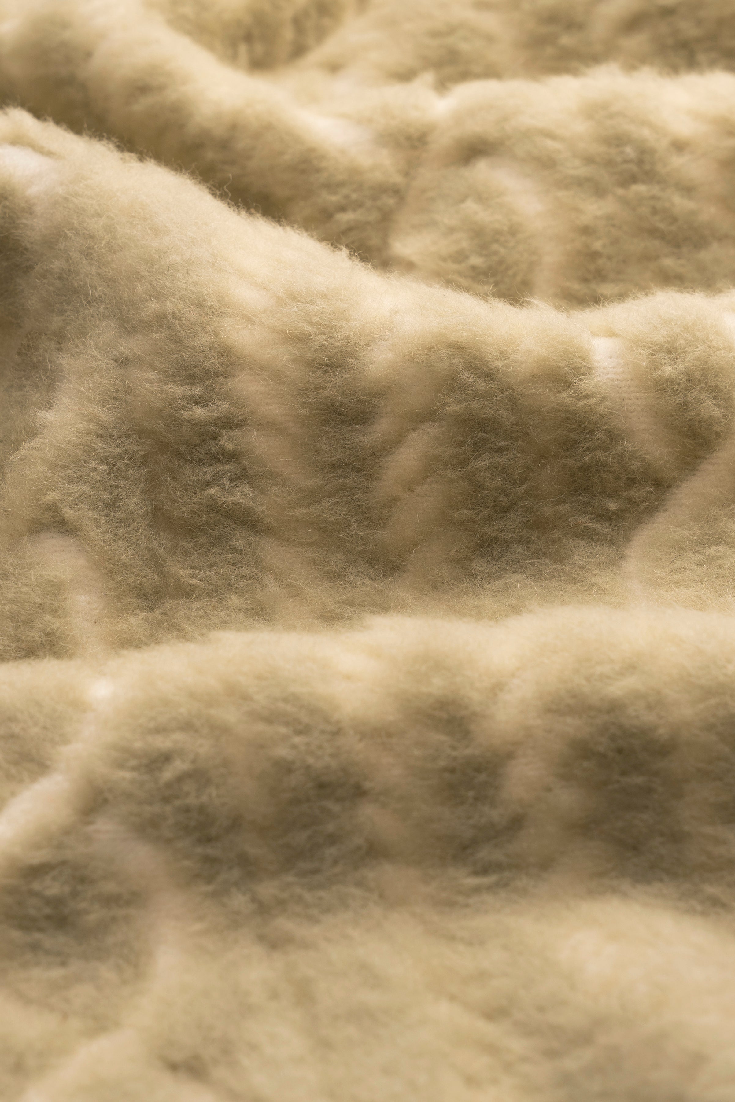 To wełna o strukturze pętelki w połączeniu z runem, dla uzyskania niezwykle charakterystycznej i dekoracyjnej tekstury, w tym wypadku wzoru o nazwie “aran”.Surowiec układa się w klasyczny, swetrowy wzór, jednak wykonany w technice dziania futerkowej. Sprawdzi się idealnie w cieplejsze dni zimy w połączeniu z grubszą warstwą ubrań oraz w porach przejściowych wiosny czy lata.