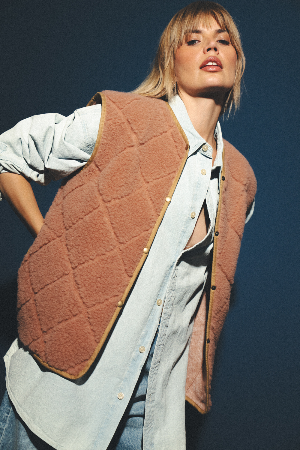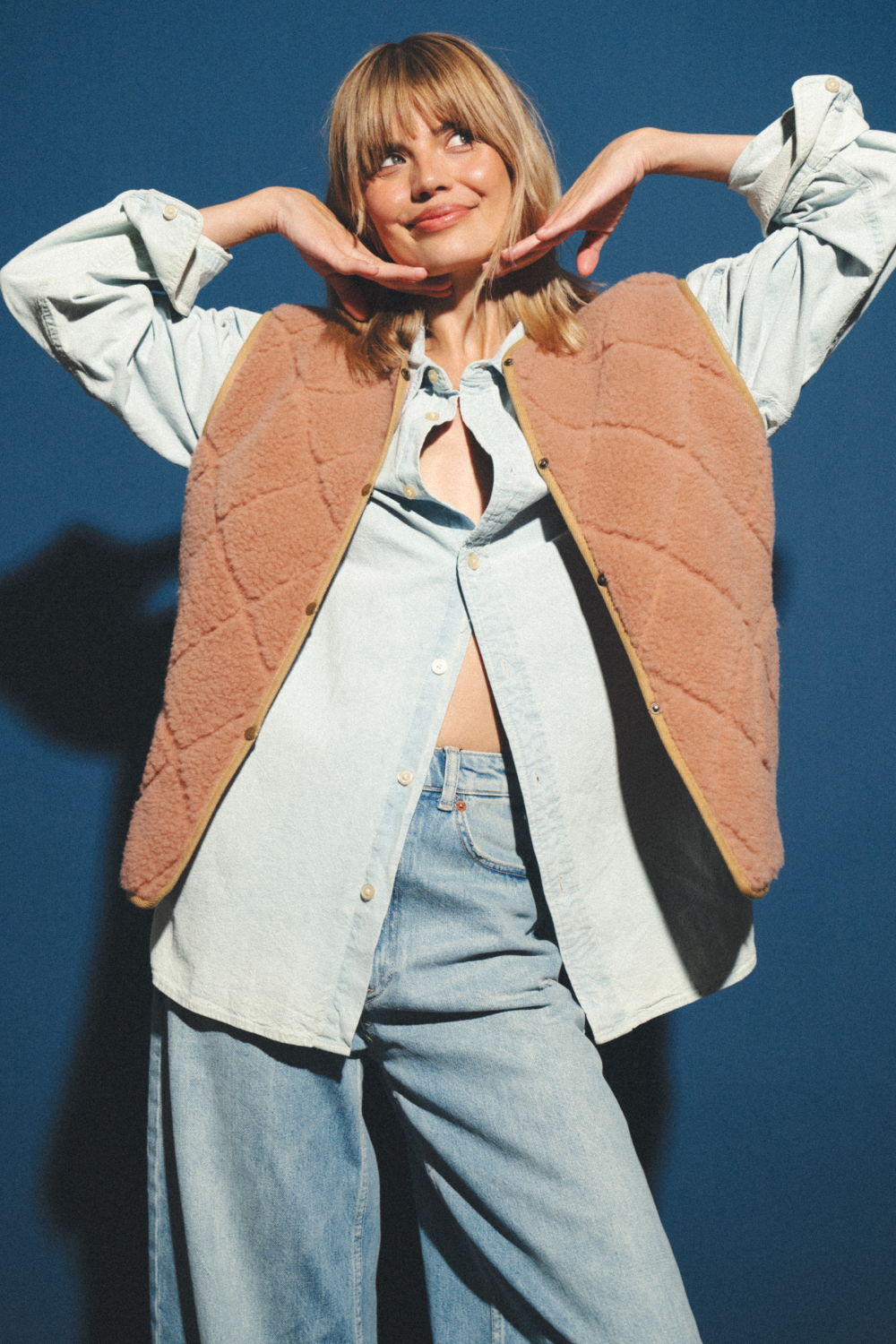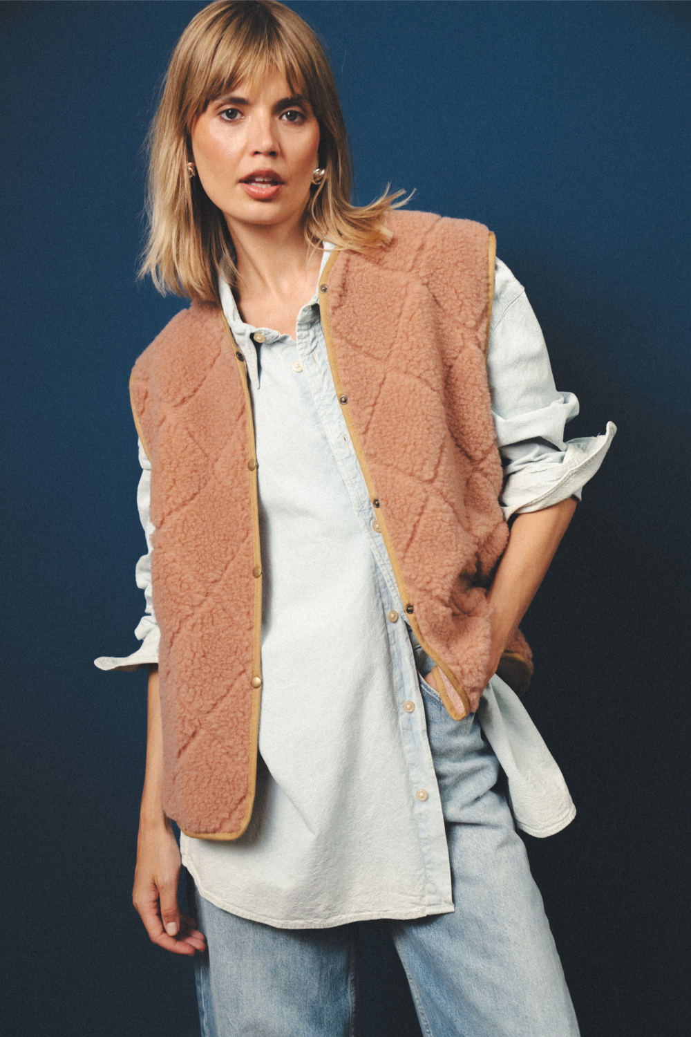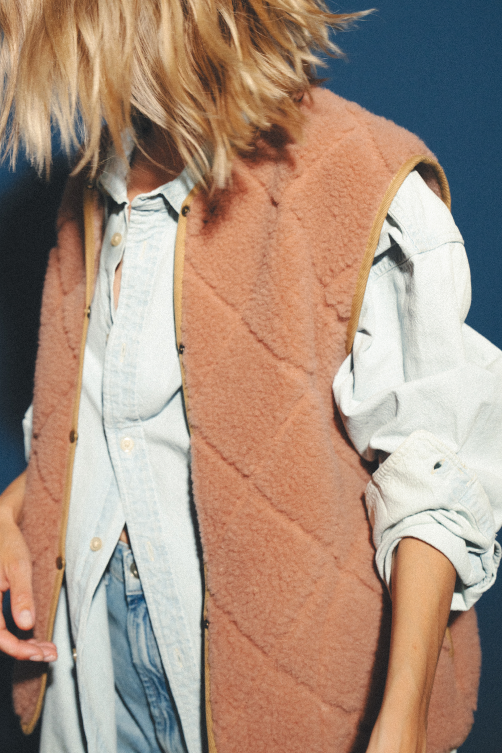 LIL to klasyczna kamizelka o długości zakrywającej biodra, stworzona z myślą o całorocznym użytkowaniu i uniwersalnym charakterze. Uszyta z wełny z wycinanym wzorem przypominającym pikowanie w kwadraty, łączy funkcjonalność i subtelną dekoracyjność. Model wykończony jest bawełnianą lamówką w jodełkę, zapinany na metalowe napy i wyposażony w wygodne, ciepłe kieszenie. LIL to propozycja, która doskonale ogrzewa, jednocześnie pozostając niezwykle wszechstronnym elementem garderoby