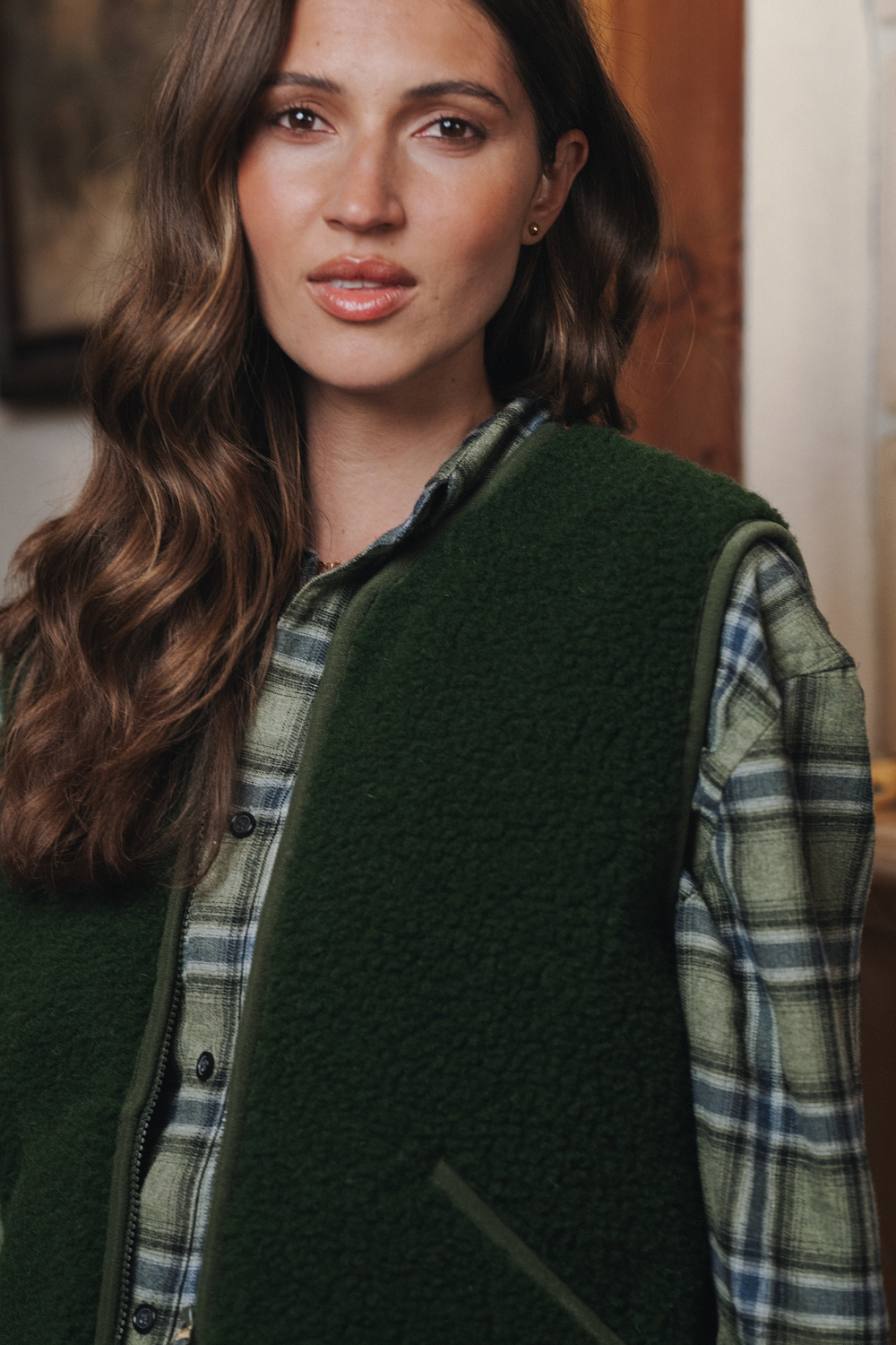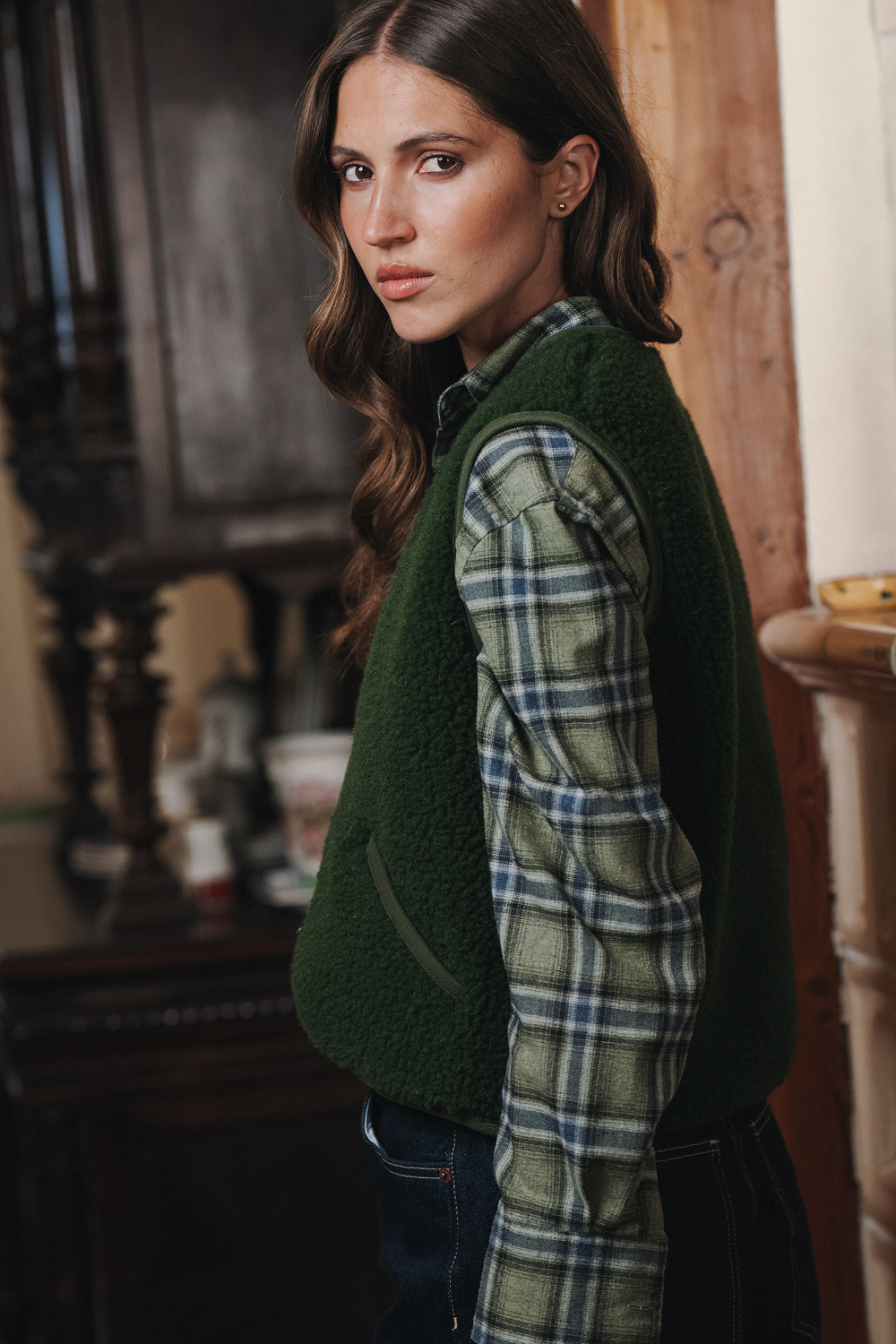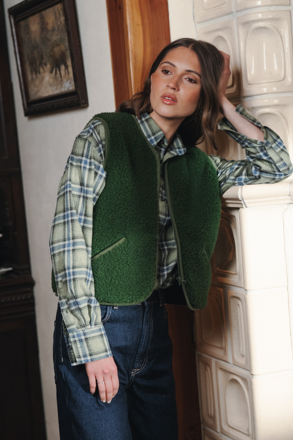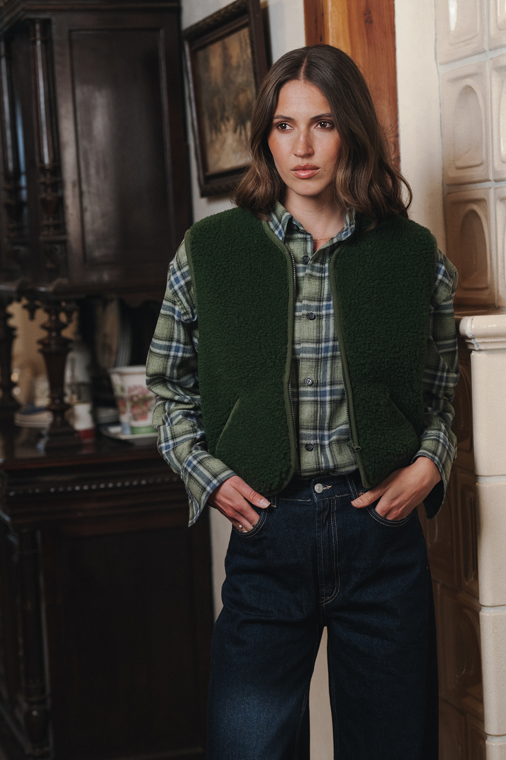 Krótka, wełniana kamizelka zapinana na zamek. Model o pudełkowym, minimalistycznym kroju, wykończony lamówką w kolorze wełny.