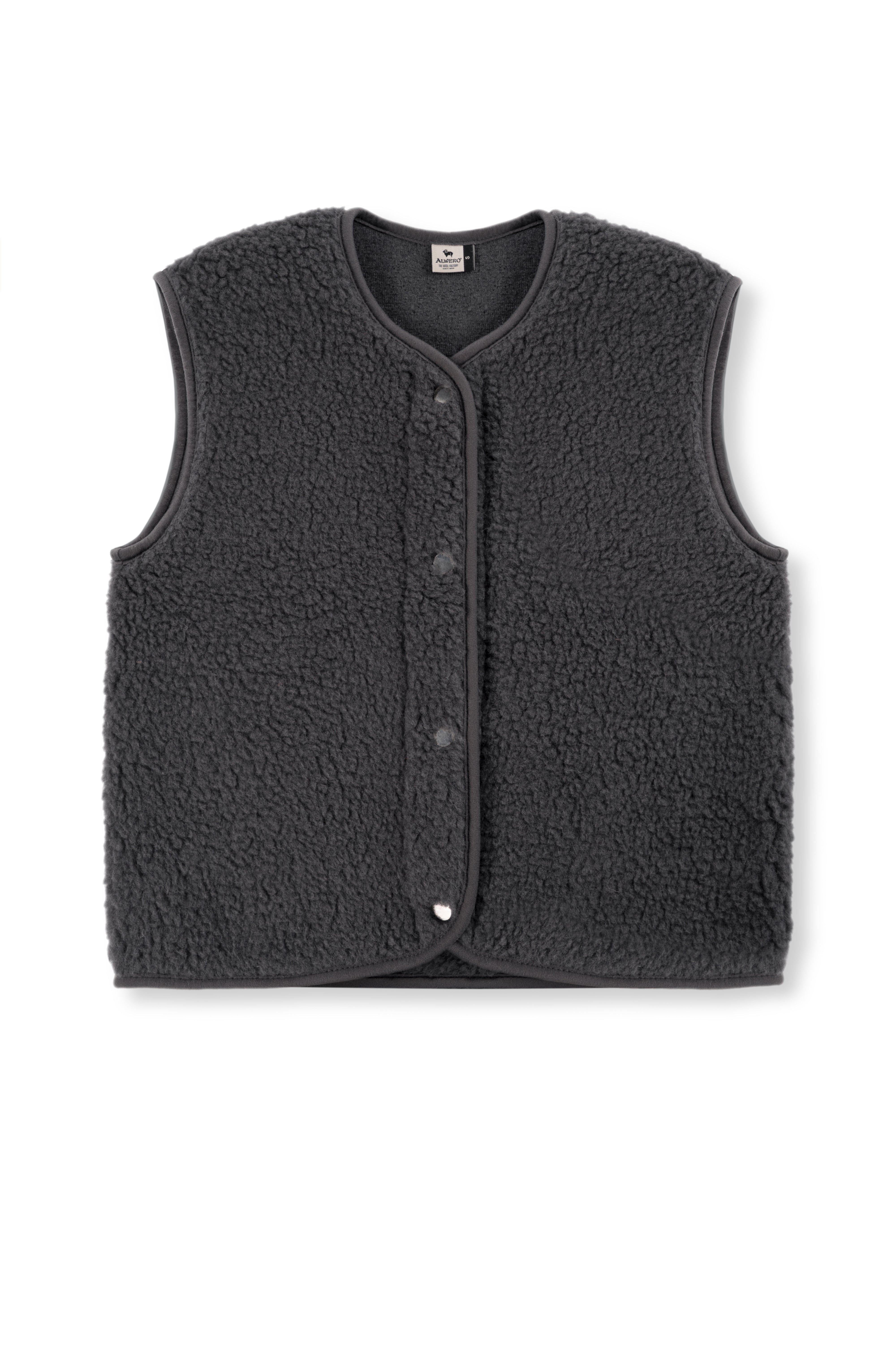 Krótka, wełniana kamizelka zapinana na napy. Model o pudełkowym, minimalistycznym kroju, wykończony ozdobną lamówką