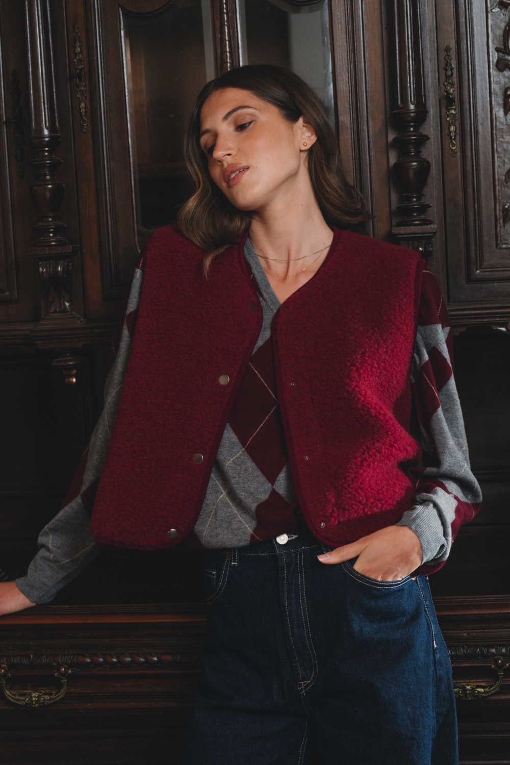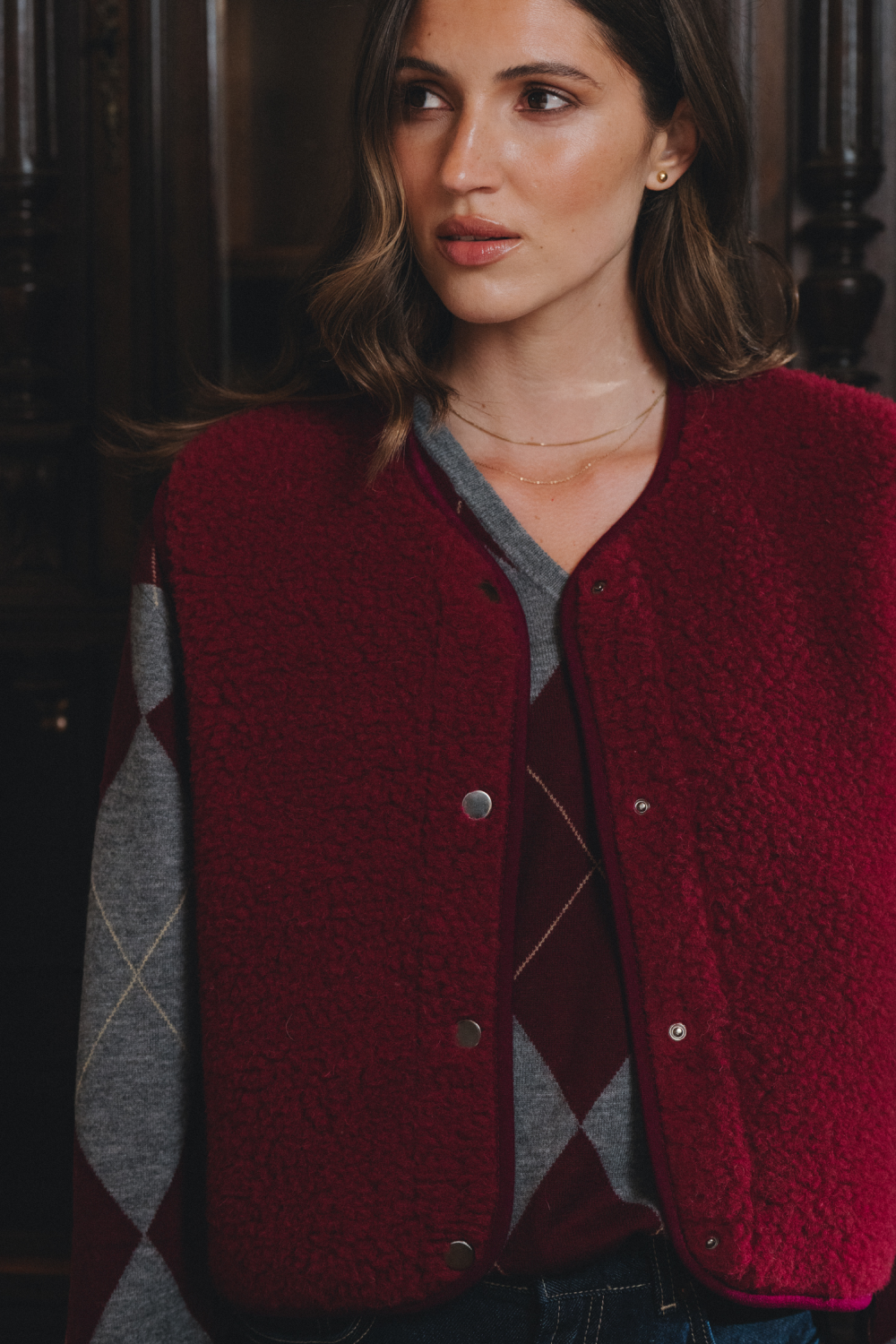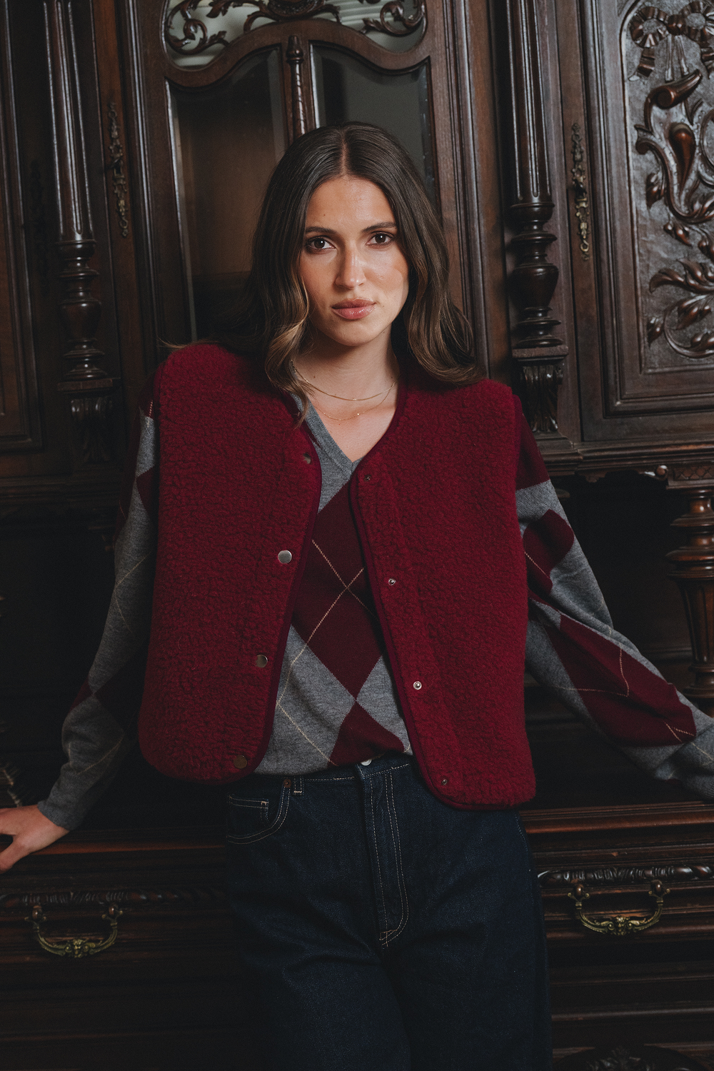 Krótka, wełniana kamizelka zapinana na napy. Model o pudełkowym, minimalistycznym kroju, wykończony ozdobną lamówką.