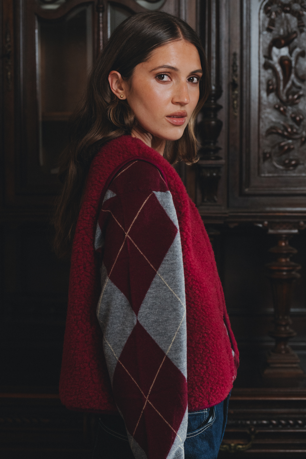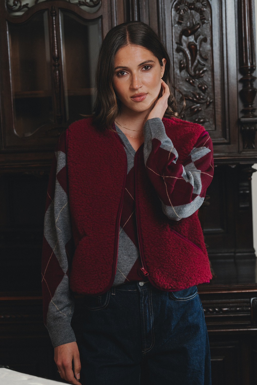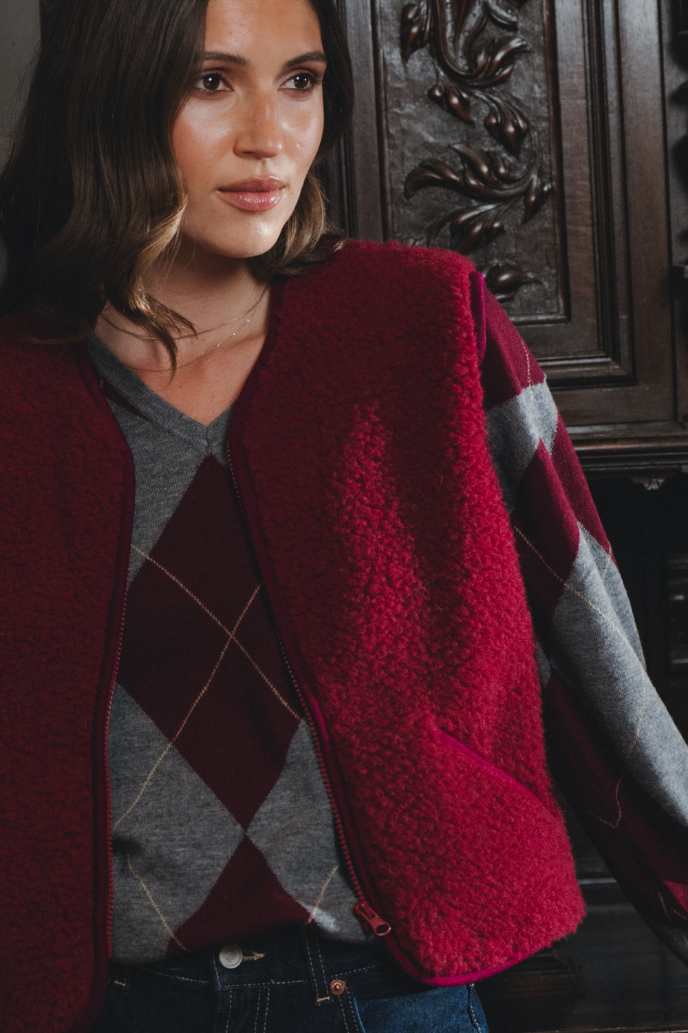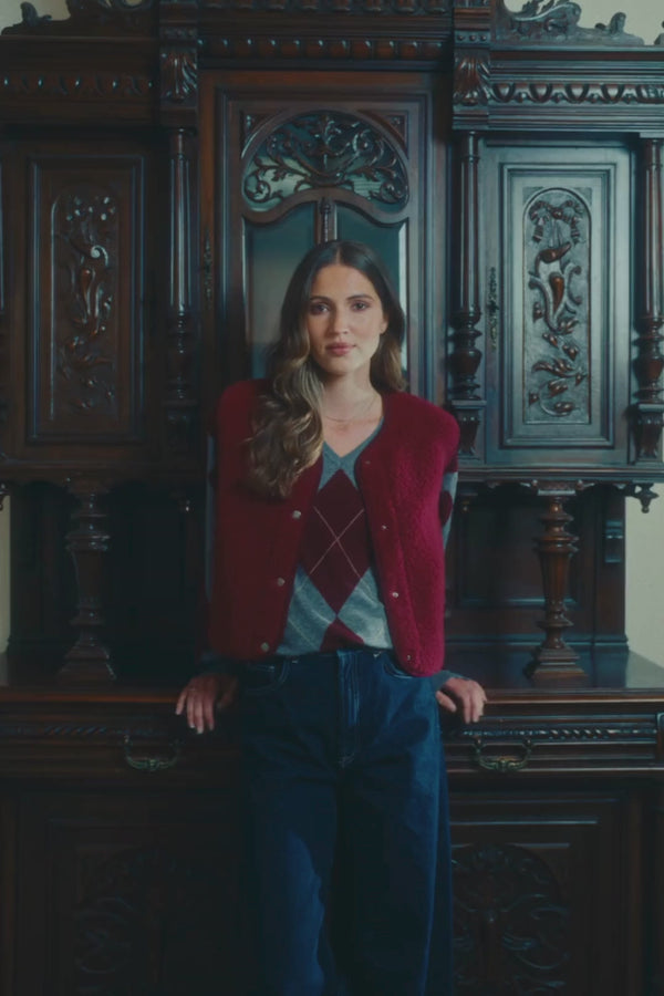 Krótka, wełniana kamizelka zapinana na napy. Model o pudełkowym, minimalistycznym kroju, wykończony ozdobną lamówką.