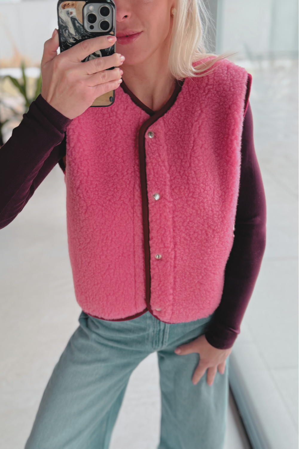 Krótka, wełniana kamizelka zapinana na napy. Model o pudełkowym, minimalistycznym kroju, wykończony ozdobną lamówką.