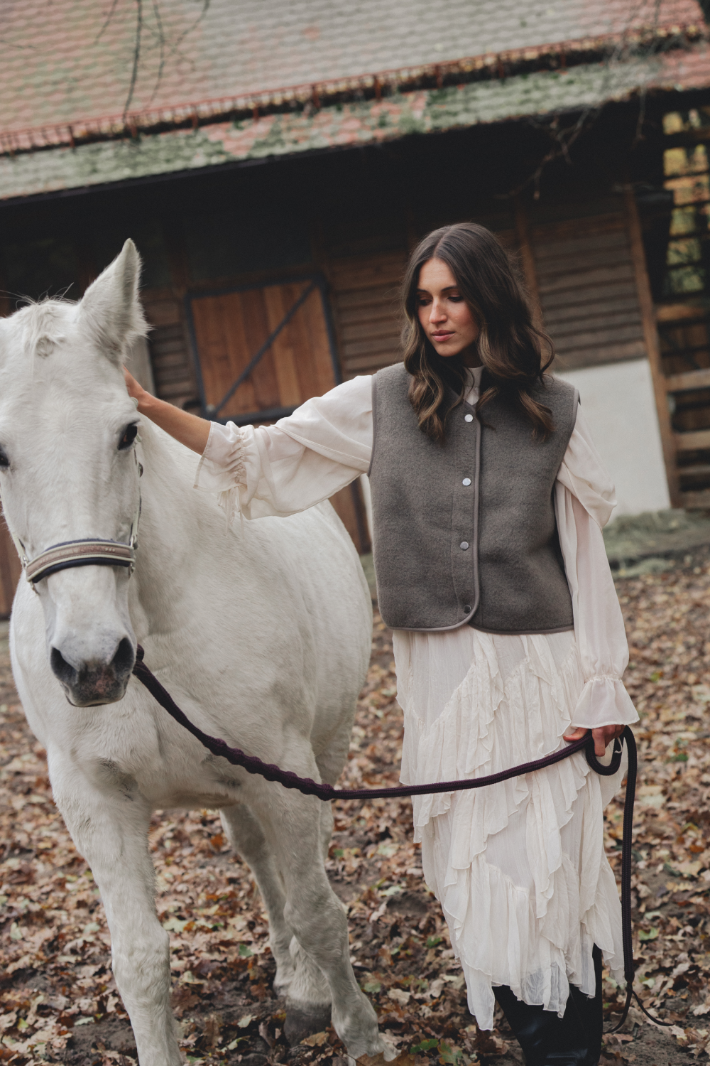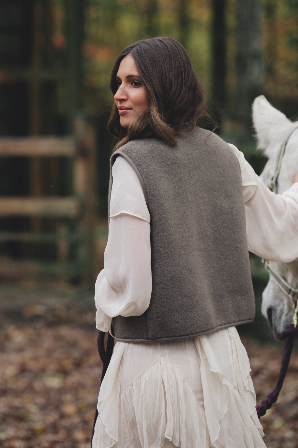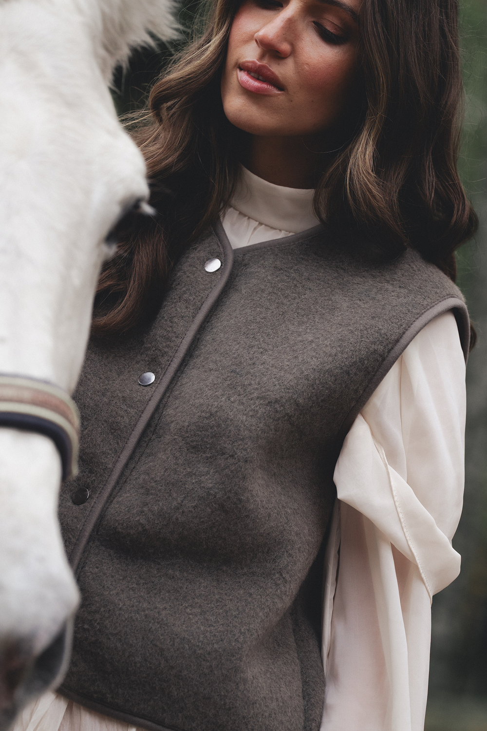 Krótka, wełniana kamizelka zapinana na napy. Model o pudełkowym, minimalistycznym kroju, wykończony ozdobną lamówką.