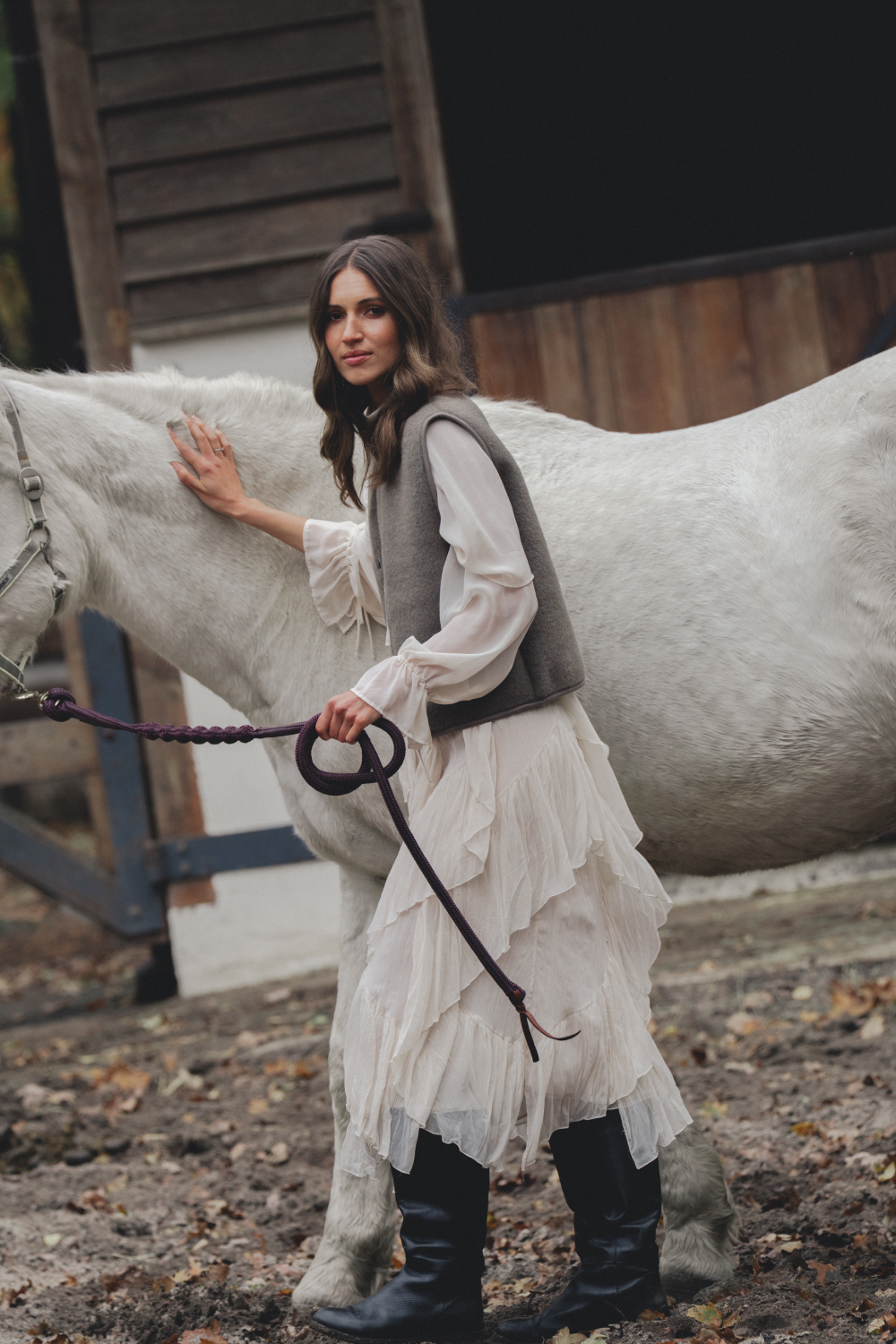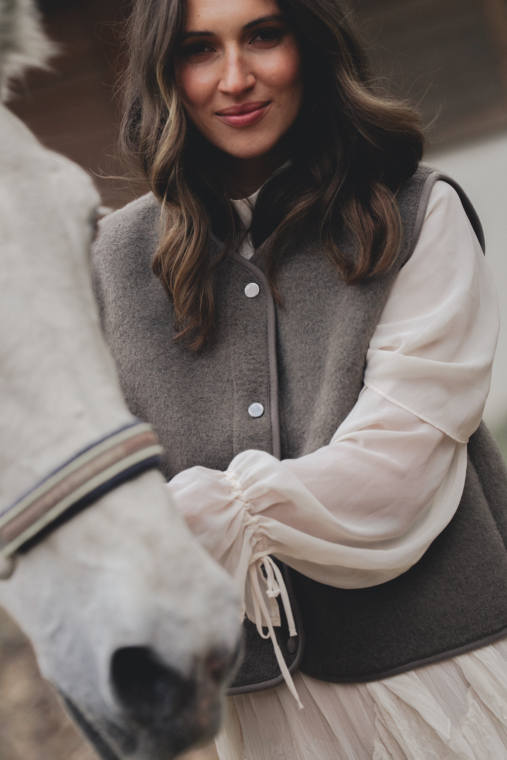 To nasz autorski materiał. To lekki filc ubraniowy, mający swój niepowtarzalny charakter i cechy. Surowiec ten wizualnie daje mniejszą objętość, dzięki obustronnie gładkiej, miękkiej i zwartej strukturze, przy równoczesnej niezwykłej lekkości. Dzięki tym cechom wełnę felted używamy do projektów również o bardziej dopasowanej formie. Charakteryzuje ją nie tylko elegancki wygląd, ale również bardzo dobre walory cieplne. Modele bez podszewki sprawdzą się w mniej mroźnych warunkach niż typowy baranek. Osobom ze szczególnie wrażliwą skórą zalecany noszenie na grubszą warstwę ubrań lub wybranie modelu z podszewką, która zapewni dodatkową ochronę przed wiatrem.