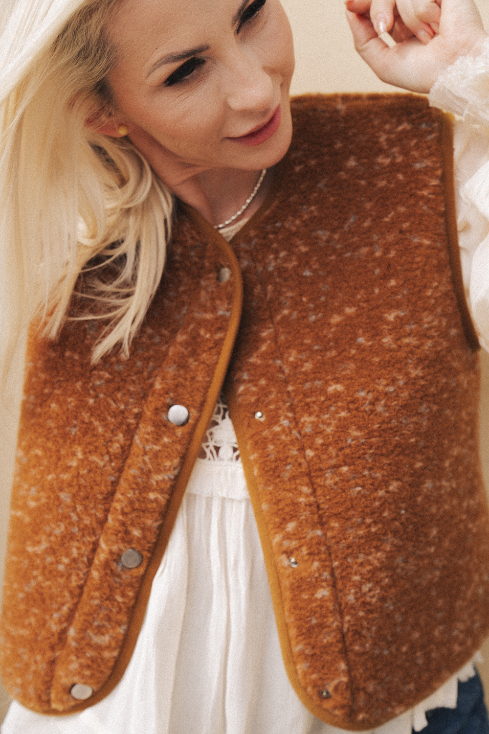 Krótka, wełniana kamizelka zapinana na napy. Model o pudełkowym, minimalistycznym kroju, wykończony ozdobną lamówką.