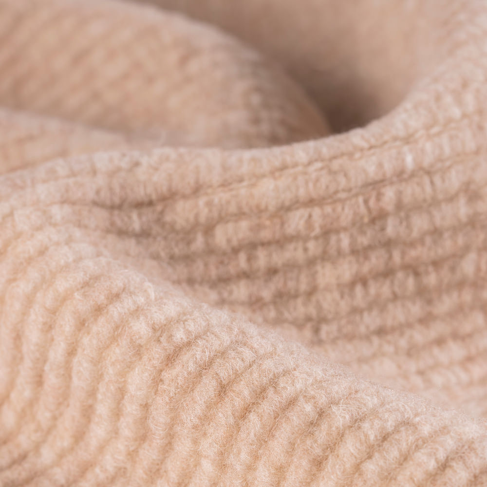 To wełna o strukturze pętelki w połączeniu z runem, dla uzyskania niezwykle charakterystycznej i dekoracyjnej tekstury, w tym wypadku wzoru o nazwie “aran”.Surowiec układa się w klasyczny, swetrowy wzór, jednak wykonany w technice dziania futerkowej. Sprawdzi się idealnie w cieplejsze dni zimy w połączeniu z grubszą warstwą ubrań oraz w porach przejściowych wiosny czy lata.