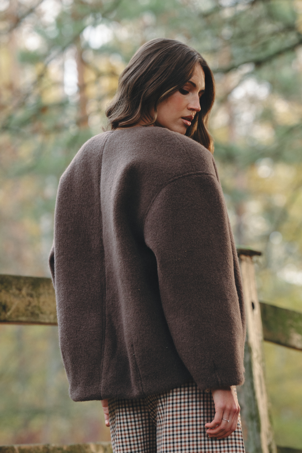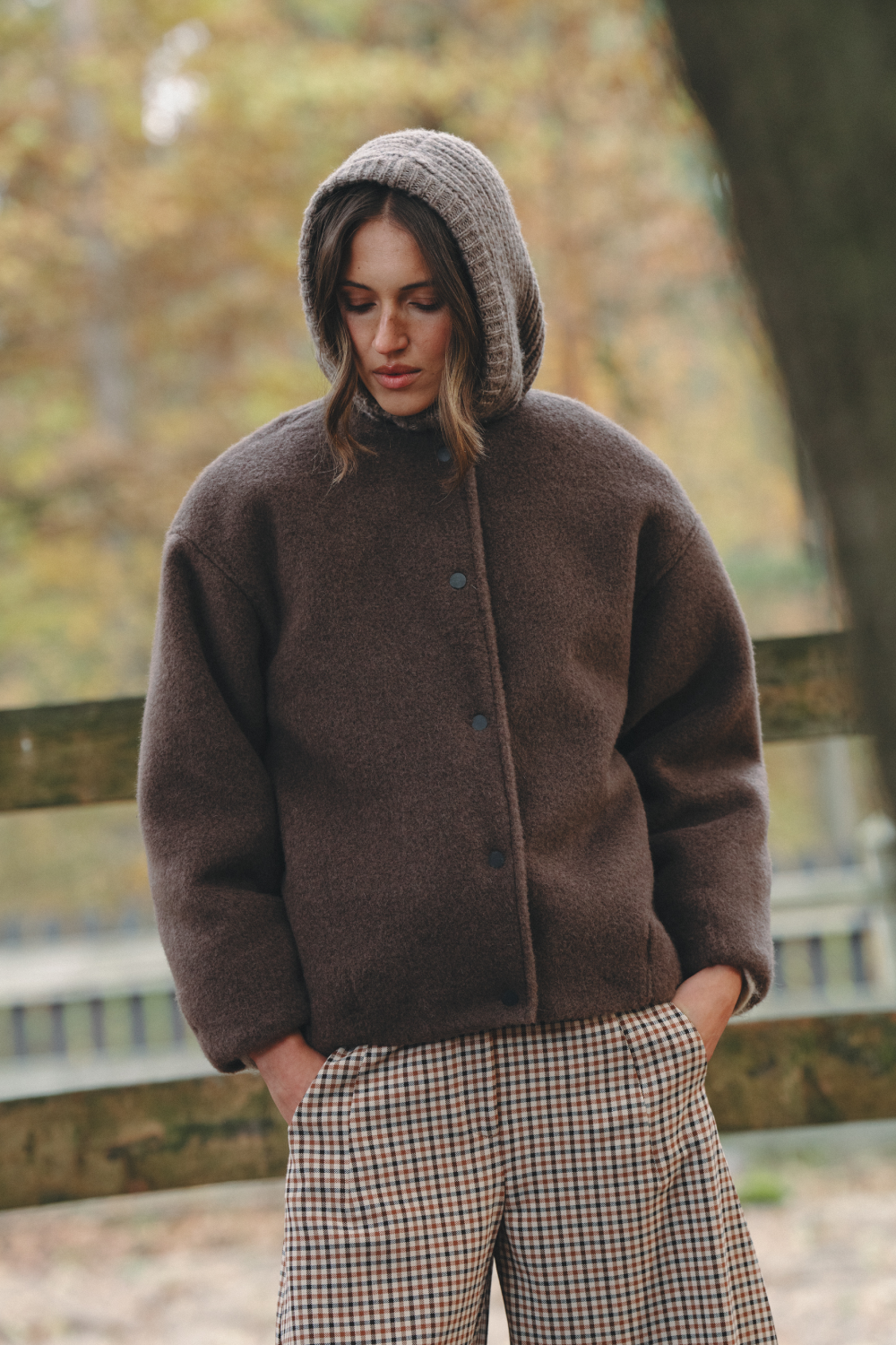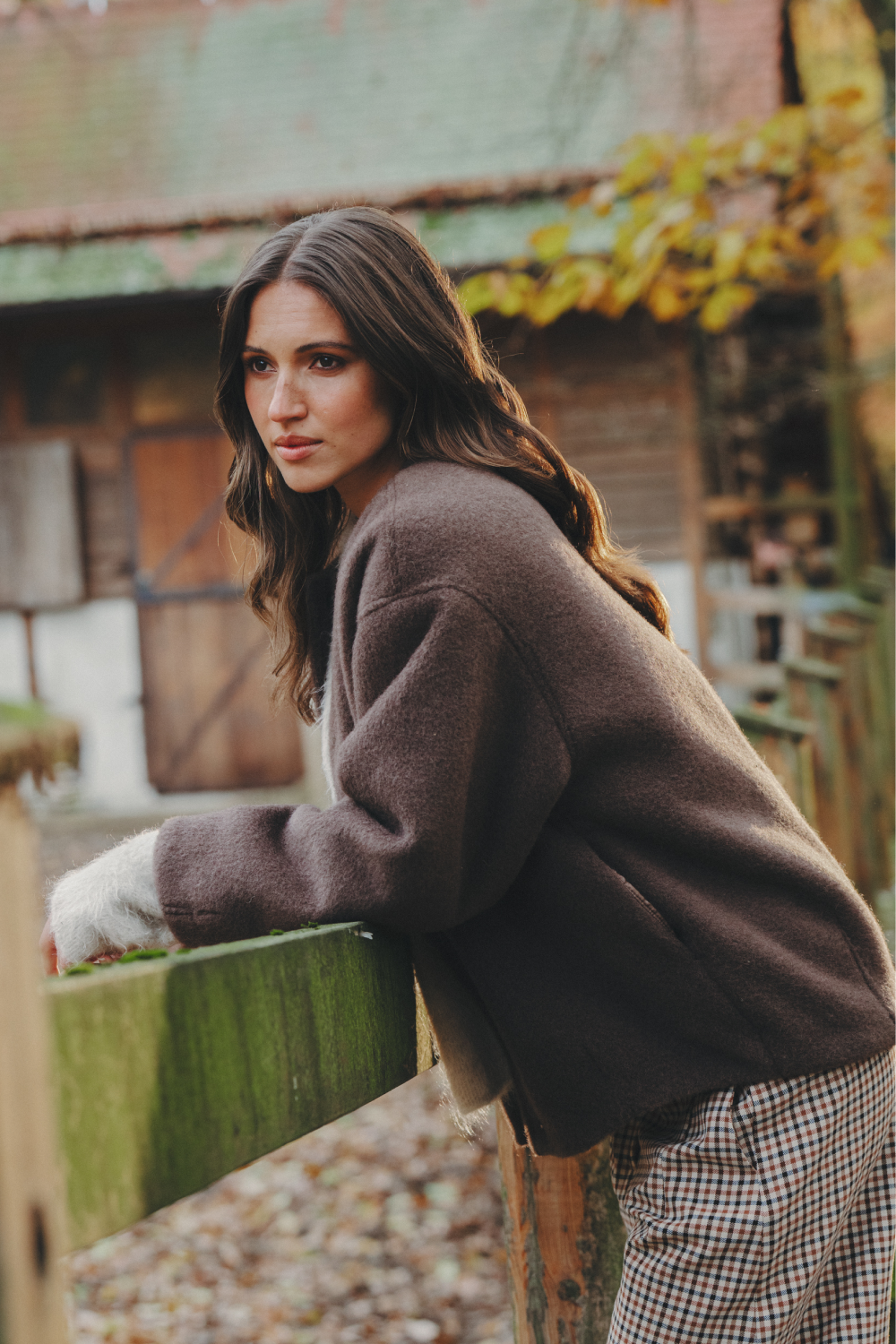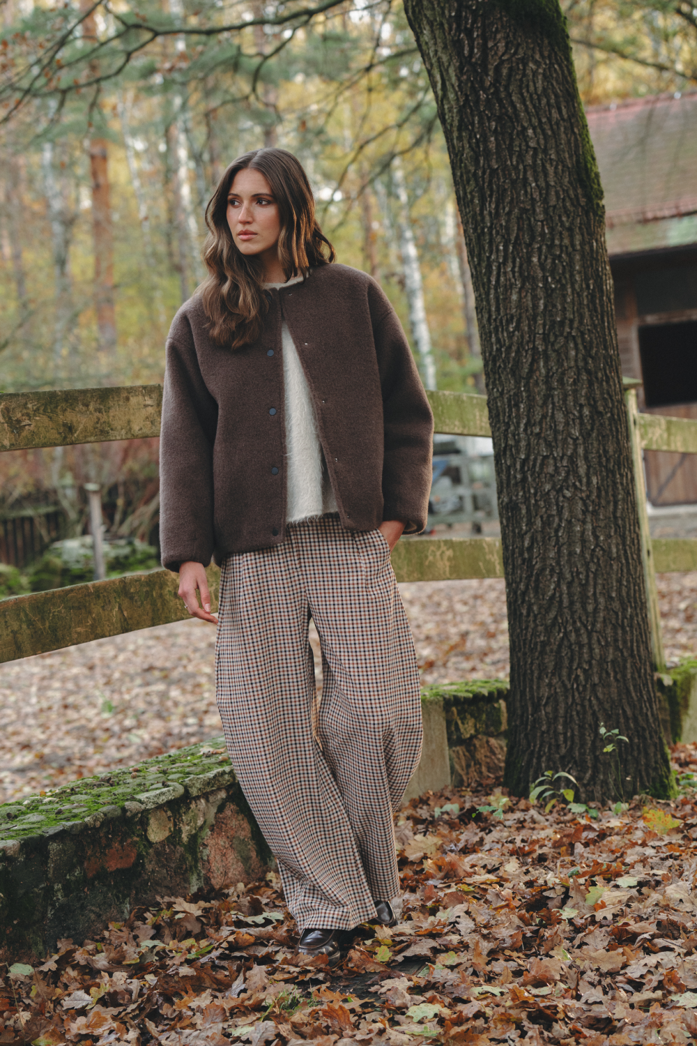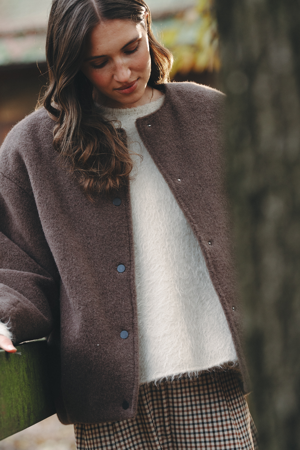JAG to wełniana kurtka uszyta z pięknej, szlachetnej wełny o lekko filcowanej strukturze. Jednorzędowy model bez kołnierza, z dwiema bocznymi kieszeniami, ma luźną, bomberkową linię podkreśloną niewielkimi zaszewkami w okolicach bioder i obniżoną linią ramion. Zapinana na eleganckie metalowe kapsle, a wewnątrz wykończona podszewką z acetatu, zapewnia komfort i subtelną elegancję. JAG to ponadczasowa, minimalistyczna propozycja, która uzupełni wiele stylizacji.