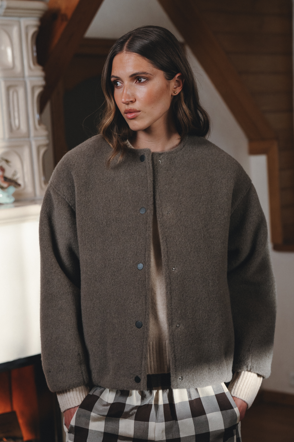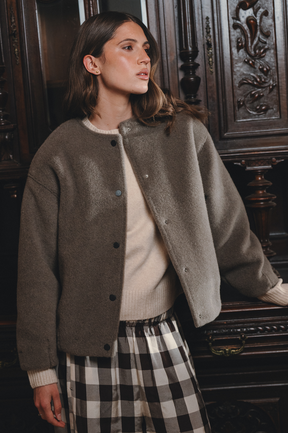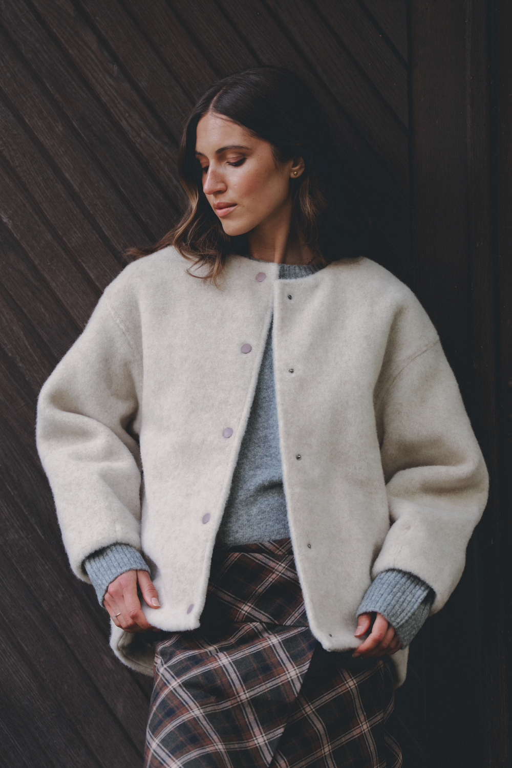 JAG to wełniana kurtka uszyta z pięknej, szlachetnej wełny o lekko filcowanej strukturze. Jednorzędowy model bez kołnierza, z dwiema bocznymi kieszeniami, ma luźną, bomberkową linię podkreśloną niewielkimi zaszewkami w okolicach bioder i obniżoną linią ramion. Zapinana na eleganckie metalowe kapsle, a wewnątrz wykończona podszewką z acetatu, zapewnia komfort i subtelną elegancję. JAG to ponadczasowa, minimalistyczna propozycja, która uzupełni wiele stylizacji.