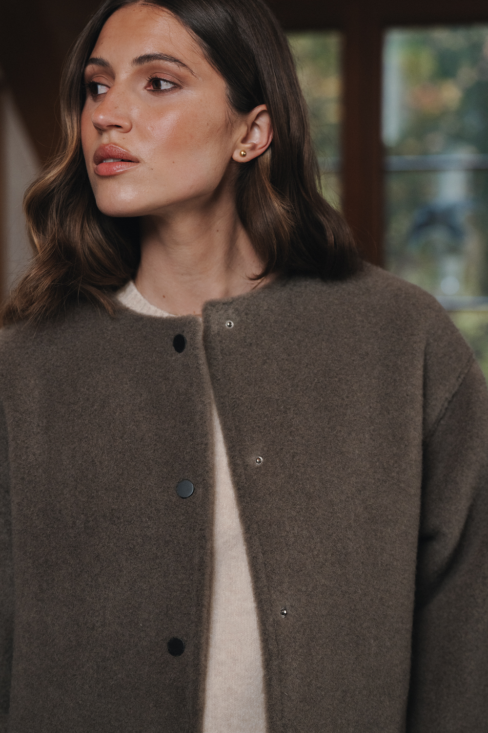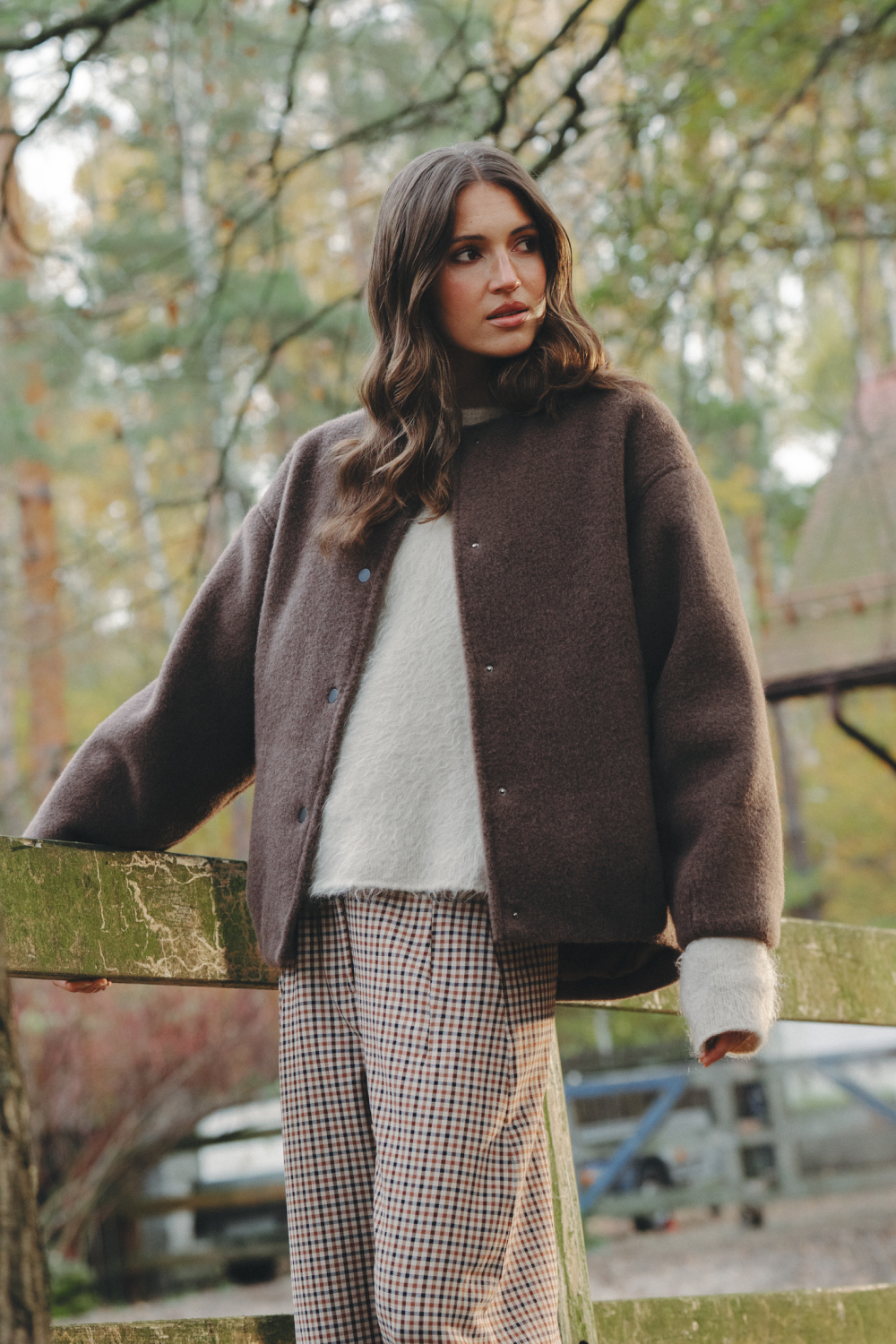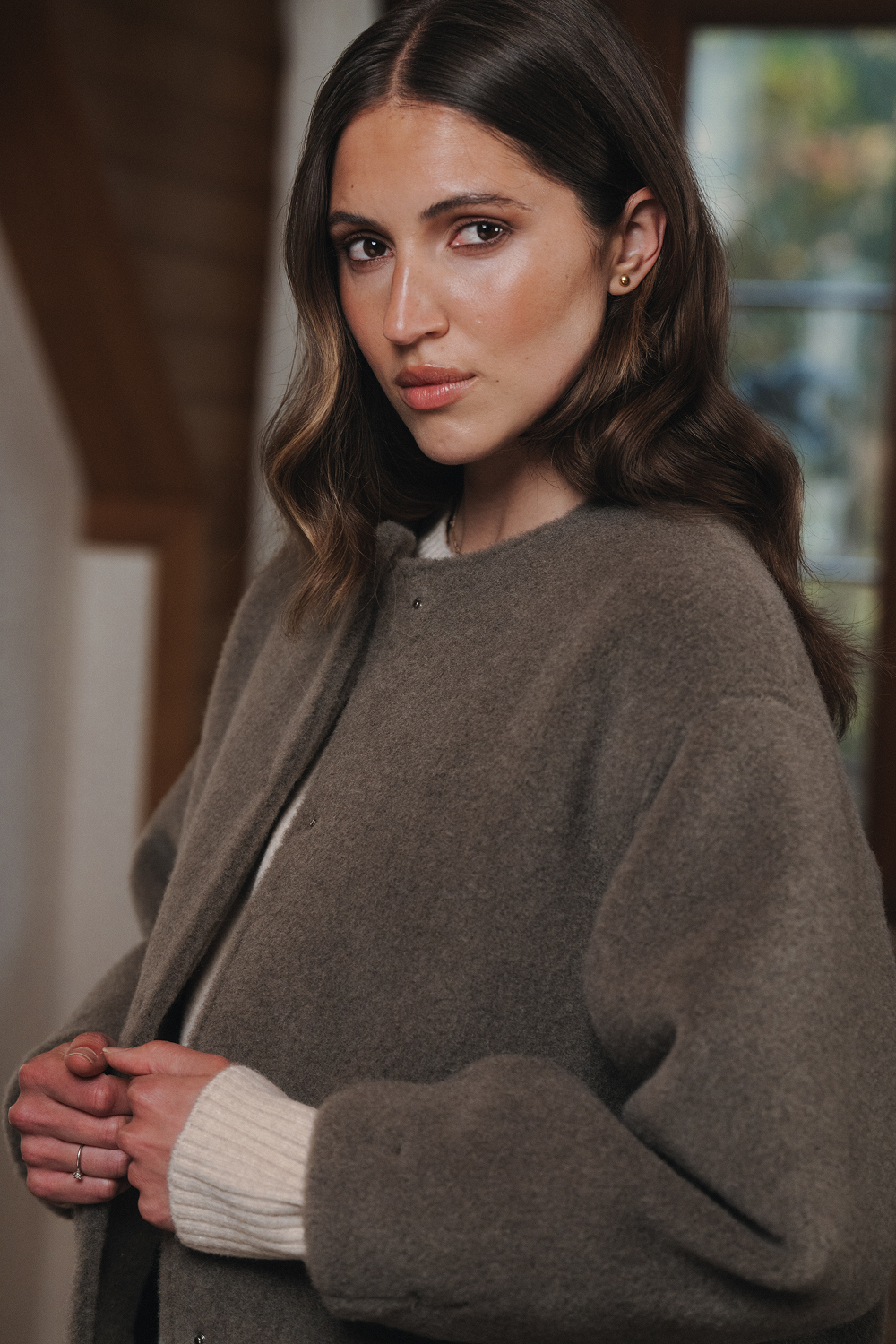 JAG to wełniana kurtka uszyta z pięknej, szlachetnej wełny o lekko filcowanej strukturze. Jednorzędowy model bez kołnierza, z dwiema bocznymi kieszeniami, ma luźną, bomberkową linię podkreśloną niewielkimi zaszewkami w okolicach bioder i obniżoną linią ramion. Zapinana na eleganckie metalowe kapsle, a wewnątrz wykończona podszewką z acetatu, zapewnia komfort i subtelną elegancję. JAG to ponadczasowa, minimalistyczna propozycja, która uzupełni wiele stylizacji.