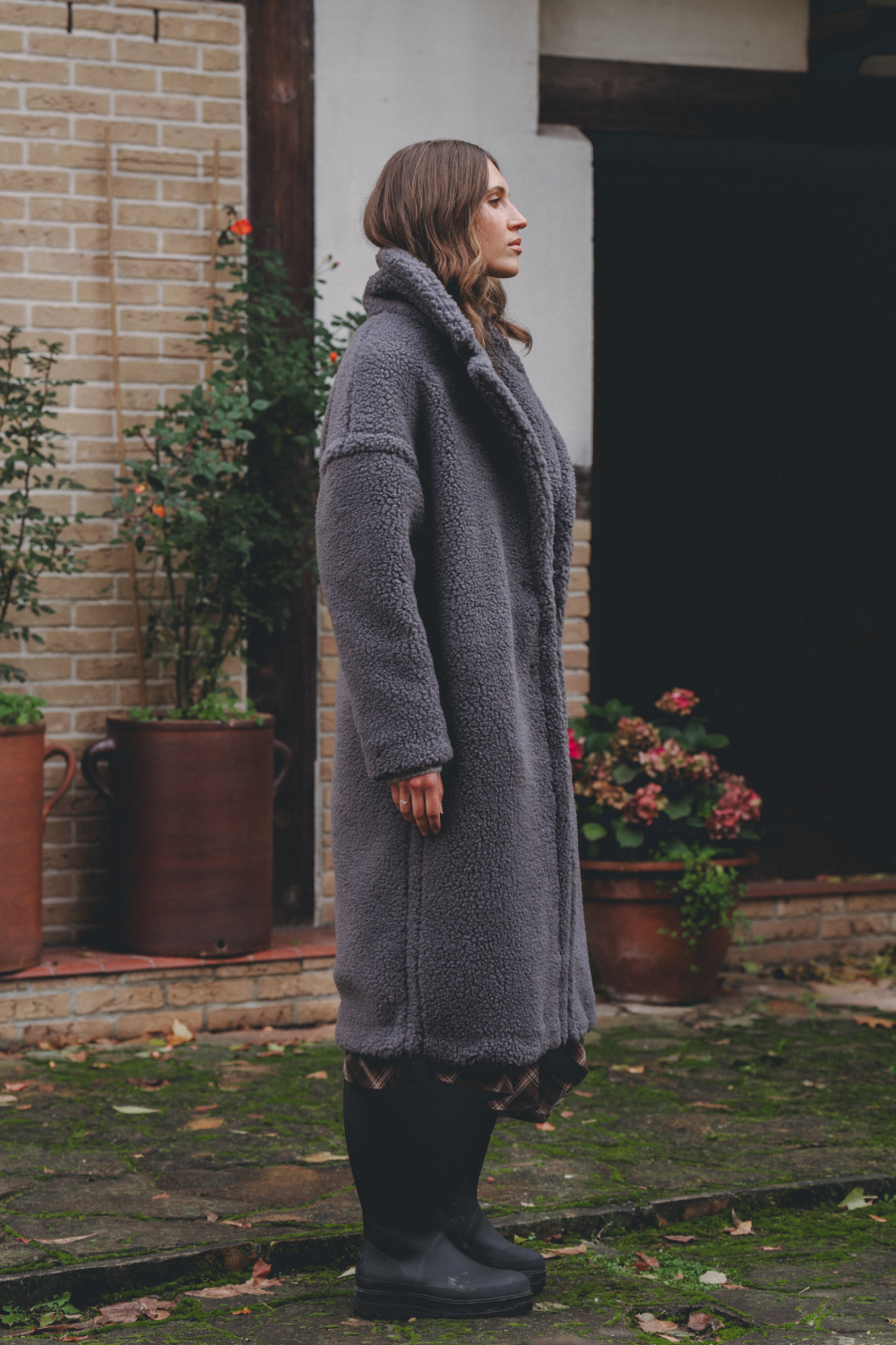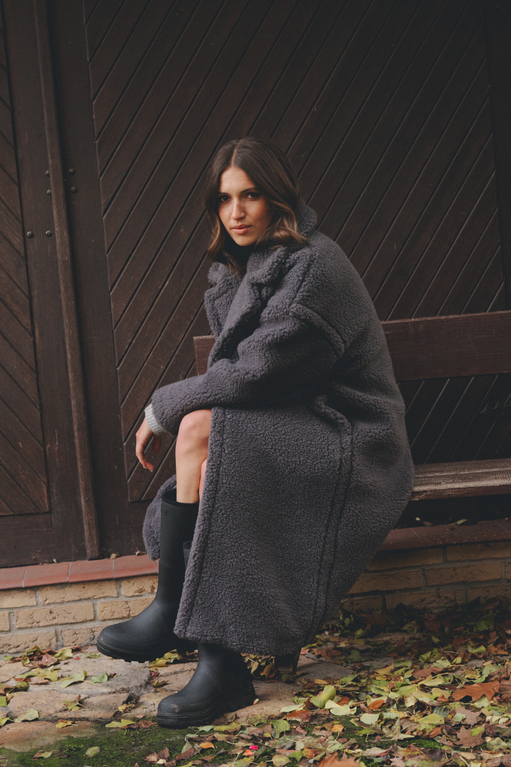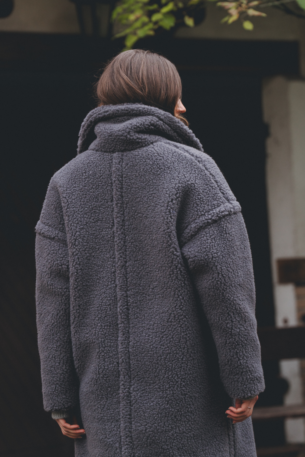 TEDDY MAX to nasza nowa wersja klasycznego płaszcza w stylu teddy, wykonana z miękkiej, lekkiej i ciepłej wełny baranizowanej. Model posiada duży kołnierz oraz charakterystyczne przeszycia ramion, pleców oraz klap. Długość za kolano, zapięcie jednorzędowe z dyskretnymi, magnetycznymi napami.